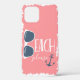 Beach theme iPhone case features the caption "Beach Please", with sunglasses replacing the letter B, and a nautical blue anchor on a weathered coral pink background. Original artwork KL Stock.