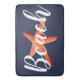 Coastal/nautical white "beach" script in white with a red starfish in the centre over navy. Accent your modern beach themed bathroom with this plush and comfy bath mat.