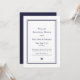 Nautical navy blue crab wedding rehearsal dinner invitations. Front - white with double navy blue border, block and script navy blue text and navy blue crab illustration bottom centre. Back is solid navy blue.