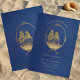 An elegant blue gold nautical invitation with a vintage air. It has a vintage ship on the waves, in an oval frame resembling a rope with four sailor's knots: above, left, right and under it. The image is golden on a classic blue background. Above it, there is the title as arched text: "we are tying the knot".