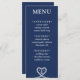 Nautical blue and white wedding reception menu. Design also features a heart shaped rope with anchor and monogram initials for the bride and groom. Personalise it with your wedding details. Great for a Navy (military) or lake house wedding.