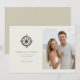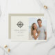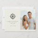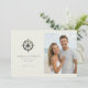 This wedding save the date features a split layout with a nautical theme, showcasing an antique ship's wheel on the left and a beach photo placeholder on the right. The design combines muted greys and browns with soft blues and whites for a serene, coastal vibe. Elegant serif and sans-serif fonts highlight the couple's names and event details, while the overall style blends classic motifs with modern simplicity. Perfect for couples who love the ocean, this template evokes joy and anticipation for their special day.