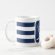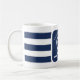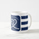 Nautical blue and white striped wedding mug. Great for a Navy (military) or lake house wedding. Design features a heart shaped rope with anchor and couple initials in the middle. Personalise it with your wedding details.