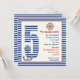 Nautical blue, white sailboat 5th birthday party invitations, featuring the number 5 patterned with blue, white stripes, an anchor and the captain’s wheel. There is a blue and white striped border around it. This cute design has a vintage feel to it. Suitable for both boys and girls children. On the back there is a cute sailboat. Colour scheme: blue, red, brown, grey. Some art elements by Alice Smith.