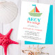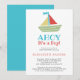 Retro style colourful nautical sailboat ship theme "Ahoy it's a Boy" baby shower invitation in vibrant teal blue and red.