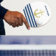This image features a boat name, and anchor on a navy blue and white striped background.