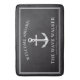 A custom bath mat tailored to the proud boat owner. It features a nautical vintage anchor followed by the boat name and the boat captain's name and the home dock location. All of this sits against a bright black backdrop to compliment your bathroom.