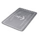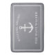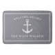A custom bath mat tailored to the proud boat owner. It features a nautical vintage anchor followed by the boat name and the boat captain's name and the home dock location. All of this sits against a soft slate grey coloured backdrop to compliment your bathroom.