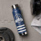 This classic nautical water bottle features a navy blue water bottle, white stripes, boat wheel with you name and tag line under. Makes a great gift for birthdays, retirements, weddings and more, for boat captains, yacht owners and anyone who loves the ocean.