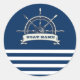 Nautical Boat Wheel, Navy Blue Stripes Classic Round Sticker