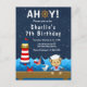 This cute and fun invitation features a nautical sailor boy monkey on a wooden deck with a seagull and a crab. In the background there is a red and white lighthouse, a cute bird on a sailboat, ocean waves and a navy blue starry night sky. The text combines bold and serif fonts for a stylish and modern look. This is perfect for a nautical themed birthday party.