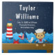 This cute and fun tile features a nautical sailor boy monkey on a wooden deck with a seagull and a crab. In the background there is a red and white lighthouse, a cute bird on a sailboat, ocean waves and a navy blue starry night sky. The text combines bold and serif fonts for a stylish and modern look. It can be personalised with your baby's birth stats, such as name, size, date and time of birth, or if you would like to give it as a shower gift you are able to edit and remove text.