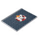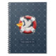 A notebook with nautical flair, this design features a white pelican flying out of a porthole style red and white life buoy. A simple navy blue and white anchors pattern covers the background and adds contrast to the design. A text template is included for adding your name, monogram or other desired text along the lower part of the design.