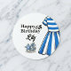 Celebrate in style with these custom Happy Birthday stickers, featuring a classic blue and white cabana striped design. These round labels add a sophisticated touch to party favors, gifts, and treats. Personalize them with the birthday girl's name for a memorable keepsake that's perfect for nautical summer celebrations. These high-quality, vibrant stickers elevate every detail, creating a polished and professional look your guests will adore.