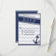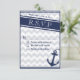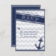 Nautical chevron navy blue and white RSVP invitations - the front design is comprised of a banner, and anchor on a rope. The designs, text, and outlines are in navy blue with a white chevron background. On the back is a larger white anchor that are on top of a navy blue chevron background. The paper by default is set to basic invitation stock, but can be changed by clicking 'choose your style' then using the Paper drop down box pick one of the options. To change the font, font size, or font colour, click the customise button below the Nautical wedding invitation. Note you may have to customise it if certain wording is too long so it fits the design better. If your satisfied with the font setup, you can use the personalise feature to change the demonstration information to your personal details. Clicking the small images of the front/back of the card with change to that side so it can be altered. When done check the information you applied is correct and that you have no spelling errors on both sides of the card.