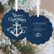 This elegant navy blue and white nautical Christmas ornament card features an anchor hanging from the words Merry Christmas, with an ocean-themed customisable holiday message and personalisation on the back.