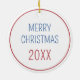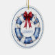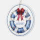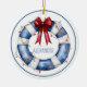 This cute coastal inspired holiday ceramic ornament features a nautical blue and white life preserver decorated with a red bow and Christmas lights. Personalise with your choice of name and special holiday text on the front and back.