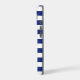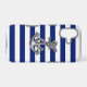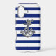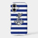 A silver chrome like applique on a navy blue style stripes print decor for a perfect nautical look.