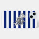 A silver chrome like applique on a navy blue style stripes print decor for a perfect nautical look.