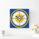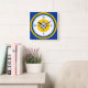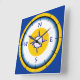 A wall clock with art of a compass in white, blue and gold on a deep blue background. The directions are in blue.