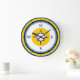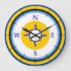 A wall clock with art of a compass rose in white, blue and gold on a deep blue background and the directions marked in block blue letters.