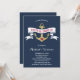 This nautical couples wedding shower invitation features a faux gold glitter anchor, a blue and white vintage banner, a cute red heart, and a navy blue background.