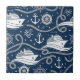 Classic nautical pattern ceramic tile featuring cruise ships, anchors, lighthouses, ropes, and ship wheels on a deep blue background. Ideal for cruise lovers, sailors, boating enthusiasts, travelers, and anyone who loves coastal nautical style.