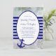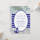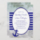 Nautical themed wedding invitation for a cruise ship ceremony. Splashing waves are the background for wide blue stripes and anchor image, with lines of custom text inside a white oval trimmed in navy blue. Include a wedding website for the wedding details.
