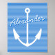 Nautical decor wall poster | personalizable anchor. Great for maritime theme kids bedroom or baby nursery room. Boat anchore with monogram, quote or name. Blue and white pinstripe design.