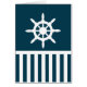 Nautical design with sailing wheel and blue and white stripes decoration on blue background