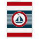Nautical design with sailing boat decoration in round shape on blue, red and white striped background