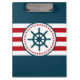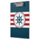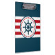Nautical design with sailing wheel decoration in round shape with stars on red, blue and white striped background