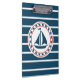 Nautical design with sailing boat decoration in round shape on blue and white striped background