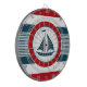 Nautical design with sailing boat decoration in round shape on blue, red and white striped background