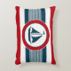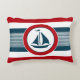Nautical design with sailing boat decoration in round shape on blue, red and white striped background