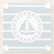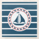 Nautical design with sailing boat decoration in round shape on blue and white striped background