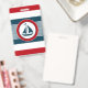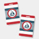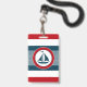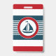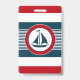 Nautical design with sailing boat decoration in round shape on blue, red and white striped background