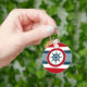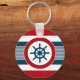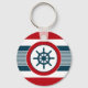 Nautical design with sailing wheel decoration in round shape on blue, red and white striped background
