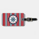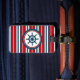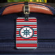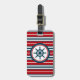 Nautical design with sailing wheel decoration in round shape on red, blue and white striped background
