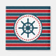 Nautical design with sailing wheel decoration in round shape with stars on red, blue and white striped background