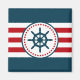 Nautical design with sailing wheel decoration in round shape with stars on red, blue and white striped background