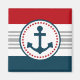 Nautical design with anchor decoration in round shape on blue, red, grey and white striped background