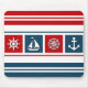 Nautical design with sailing boat, anchor, compass and sailing wheel decoration on striped background