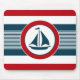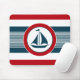 Nautical design with sailing boat decoration in round shape on blue, red and white striped background