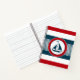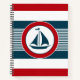 Nautical design with sailing boat decoration in round shape on blue, red and white striped background