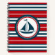 Nautical design with sailing boat decoration in round shape on red, blue and white striped background