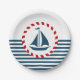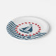 Nautical design with sailing boat decoration in round shape on blue and white striped background