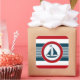 Nautical design with sailing boat decoration in round shape on blue, red and white striped background