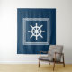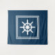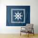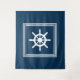 Nautical themed design with sailing wheel decoration in striped squares on blue background