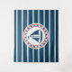 Nautical design with sailing boat decoration in round shape on blue and white striped background